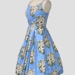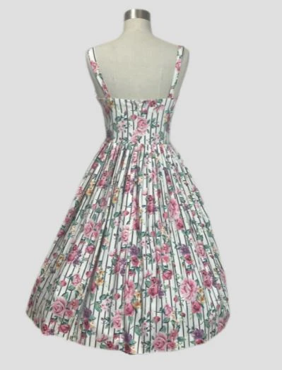 Oh so pretty! This Vintage inspired dress has a white background, with beautiful rose and lilac florals. It has a gathered bust, front waist yoke and comfortable straps. There is tucking on the skirt that allows for a beautiful fullness. It also has pockets