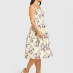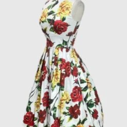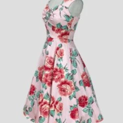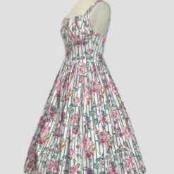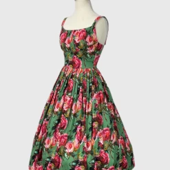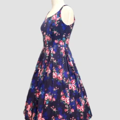 Oh so pretty! This Vintage inspired dress has a black background, with beautiful pink rose posies. It has a gathered bust, front waist yoke and comfortable straps. There is tucking on the skirt that allows for a beautiful fullness. It also has pockets
